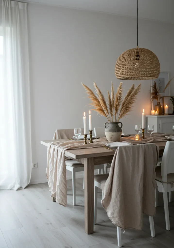 This dining room is the definition of quiet elegance. The linen tablecloth drapes effortlessly, candles flicker softly, and pampas grass in a rustic vase adds height and texture. The neutral color palette makes it timeless yet relaxed.