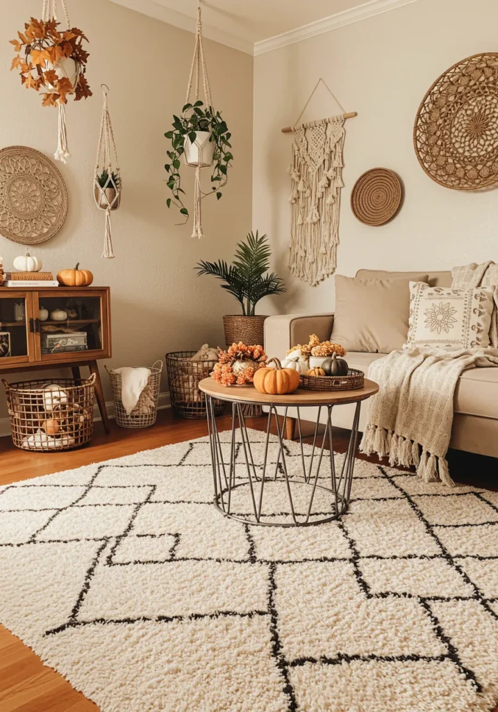 This space captures the cozy side of boho perfectly. Soft beige tones, macramé wall hangings, and hanging planters make the room feel light and organic, while pumpkins and autumn leaves add just the right hint of seasonal charm. The geometric rug ties everything together in a clean, modern way.