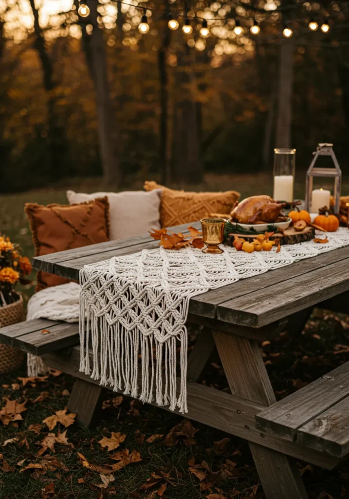 This outdoor setup makes Thanksgiving feel extra magical. A rustic wooden picnic table dressed with a macramé runner, cozy pillows, and glowing candles sets the perfect mood for an evening meal under the trees. The scattered pumpkins and golden lights add a warm, festive glow.