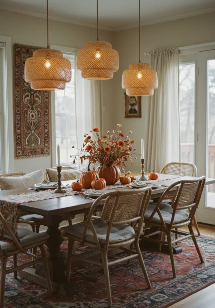 This dining room blends traditional warmth with a boho twist. Rattan chairs, woven pendant lights, and an intricate rug make the space feel layered and full of personality. The pumpkin-filled centerpiece with dried florals ties it all together beautifully.