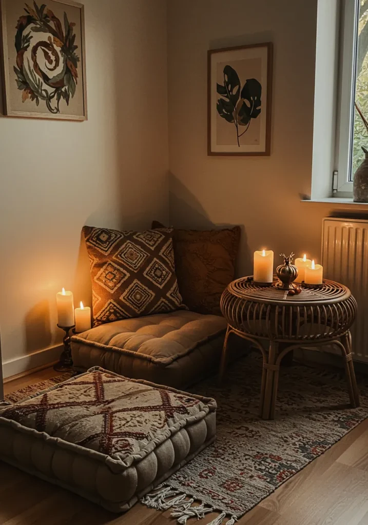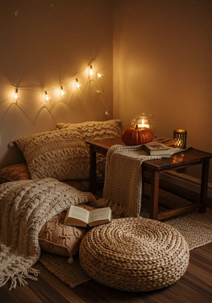 This intimate corner feels like a peaceful hideaway. The floor cushions, patterned textiles, and glowing candles create an irresistibly cozy spot to unwind. The warm earthy tones and soft lighting make it the definition of autumn comfort.