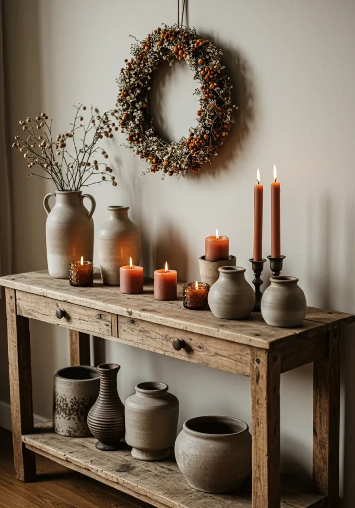 This rustic console display brings warmth to any hallway or nook. The handmade wreath, clay vases, and softly flickering candles create a look that’s timeless and relaxed. The mix of textures — wood, ceramic, and dried botanicals — feels grounded and natural.