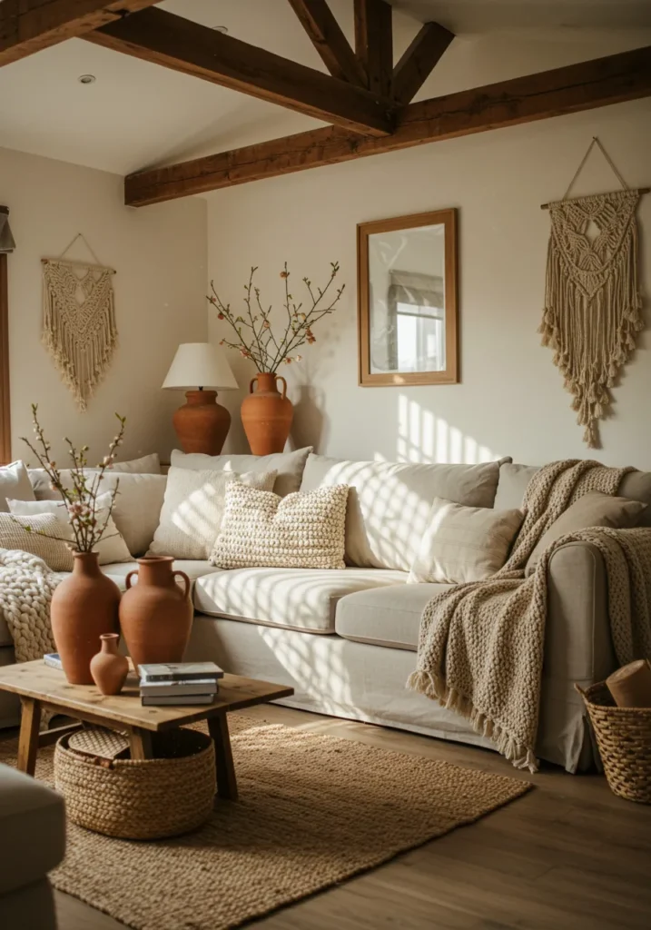 This living room captures everything I love about boho style — soft textures, natural fibers, and warm earthy shades. The woven macramé wall art, chunky knit throw, and terracotta vases give the space such character while keeping it grounded and calming.