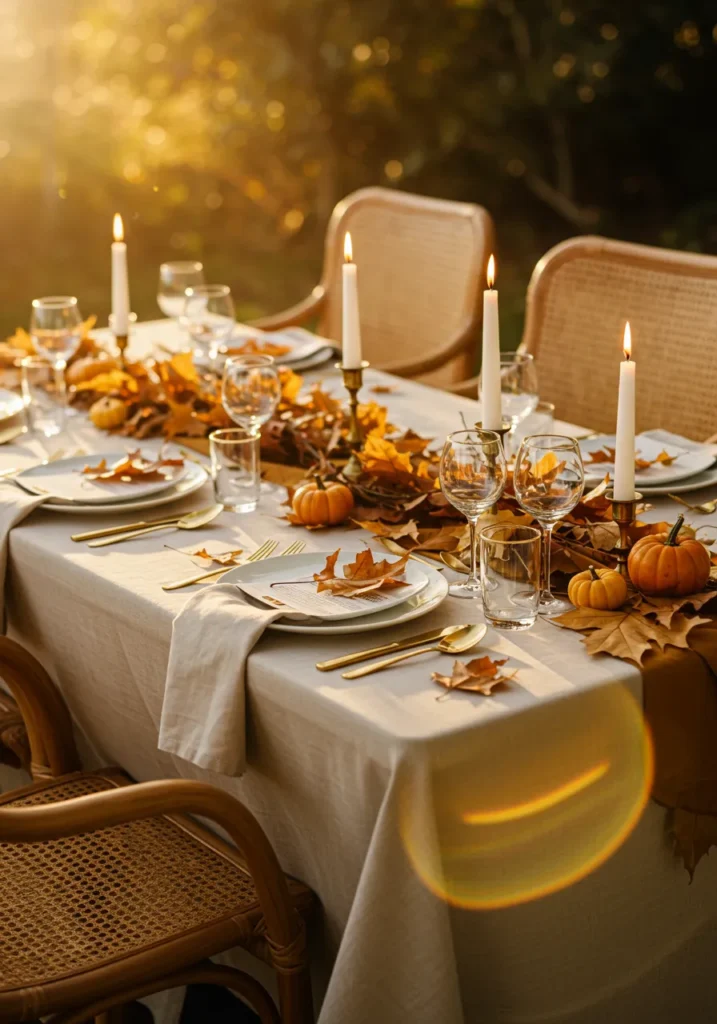 This outdoor table is pure autumn magic. The golden sunset light catches the white linens, brass flatware, and amber leaves scattered across the table. A few pumpkins and candles add that classic boho-meets-Thanksgiving charm.