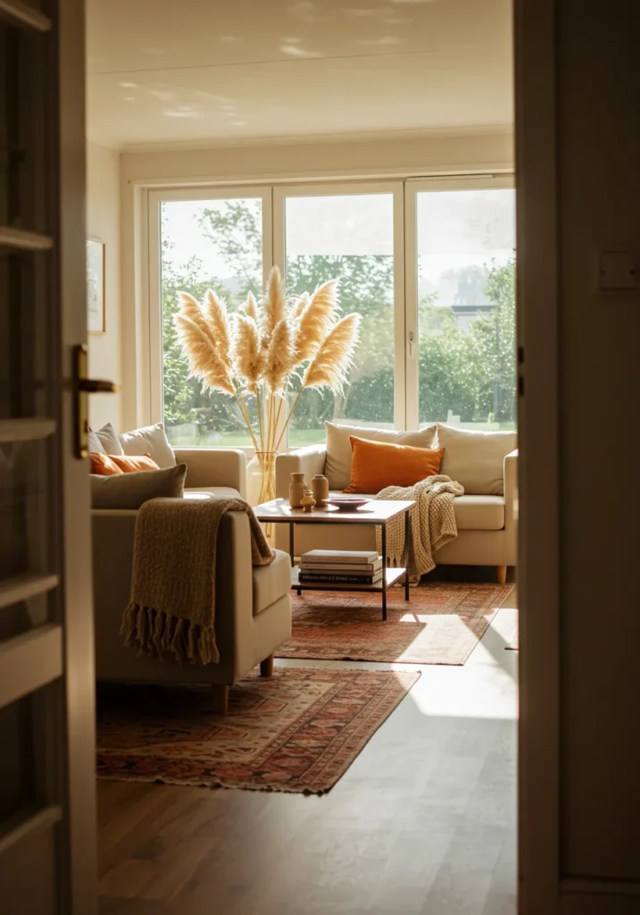 This light-filled living room feels calm and fresh with its neutral furniture, warm-toned cushions, and tall pampas grass centerpiece glowing in the sunlight. The soft textures and layered rugs give it that signature boho warmth without feeling cluttered.
