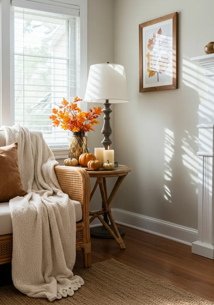 This little corner feels like a warm hug. The rattan chair, soft knit throw, and earthy tones make it so inviting, while the pumpkin arrangement and flickering candles give it a seasonal glow. The sunlight pouring in adds that perfect cozy touch.