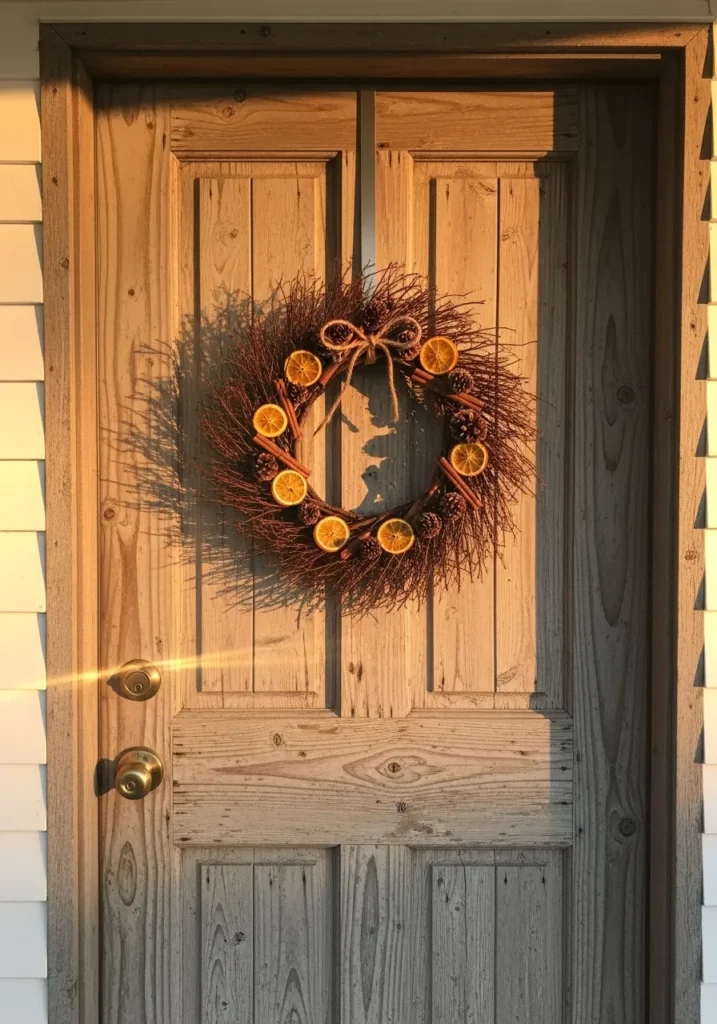 This rustic wooden door glows beautifully under the setting sun, perfectly complementing the DIY wreath made from twigs, dried oranges, pinecones, and cinnamon sticks. The simple bow at the top ties it all together for that timeless farmhouse feel. The natural light highlighting the textures makes it look effortlessly cozy and handmade.