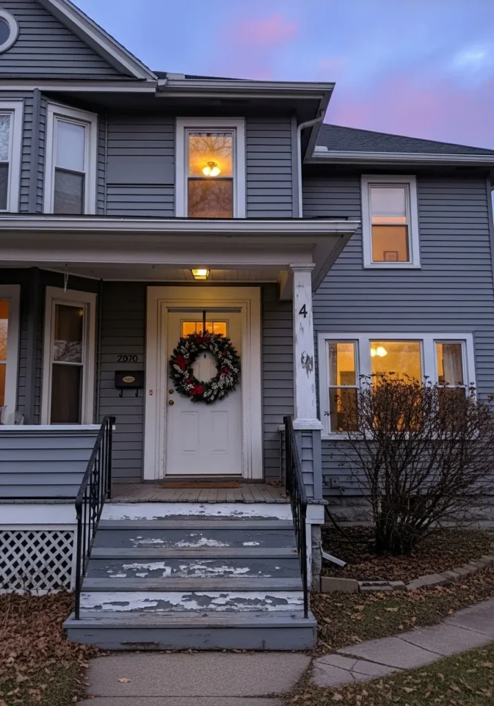 This traditional gray house feels so welcoming with its soft evening glow and a handmade wreath that perfectly captures the season. The wreath’s mix of red accents, white blossoms, and greenery adds a cheerful touch against the white front door. The worn paint on the steps and porch rails adds character, making the whole scene feel lived-in and full of charm.