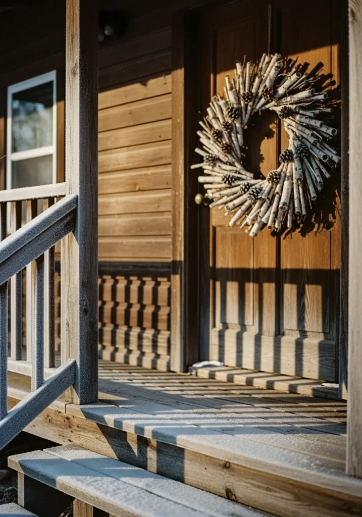 This cozy wooden cabin glows under the golden sunlight, and the handmade birch log wreath adds the perfect rustic detail. The wreath’s mix of small pinecones and natural bark textures stands out beautifully against the warm wood door. Light frost on the steps gives everything that crisp winter morning feel.