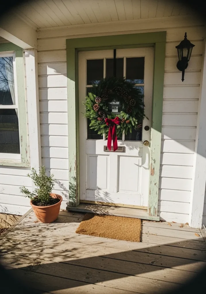 This white cottage entry feels wonderfully rustic with its soft green trim and classic wooden door. The handmade wreath, adorned with pinecones and a deep red velvet bow, brings timeless Christmas charm. The terracotta pot with a small plant and the worn wooden boards give the porch a cozy, lived-in feel that makes the whole scene effortlessly warm and inviting.