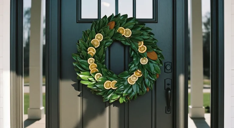 This sleek black door gets a natural upgrade with a stunning handmade wreath made of dried citrus slices and glossy green leaves. The contrast between the dark background and the bright oranges and yellows makes the whole entryway pop. The twine bow adds a sweet, simple touch that balances out the modern setting.
