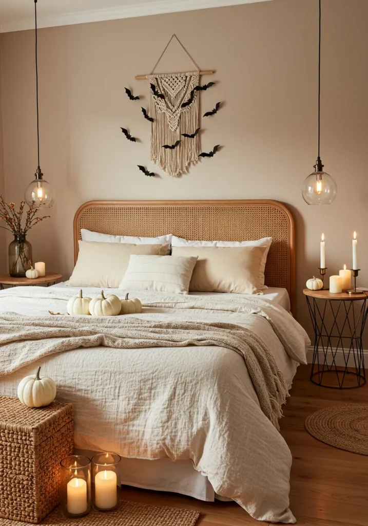 This bedroom embraces a warm, natural vibe with its woven headboard, macrame wall hanging, and soft beige linens. Instead of bold colors, it brings Halloween in with subtle touches: small white pumpkins placed on the bed and tables, black paper bats fluttering around the wall hanging, and glowing candles in glass holders. The hanging pendant lights and woven textures add to the relaxed, bohemian atmosphere that feels calm and cozy.