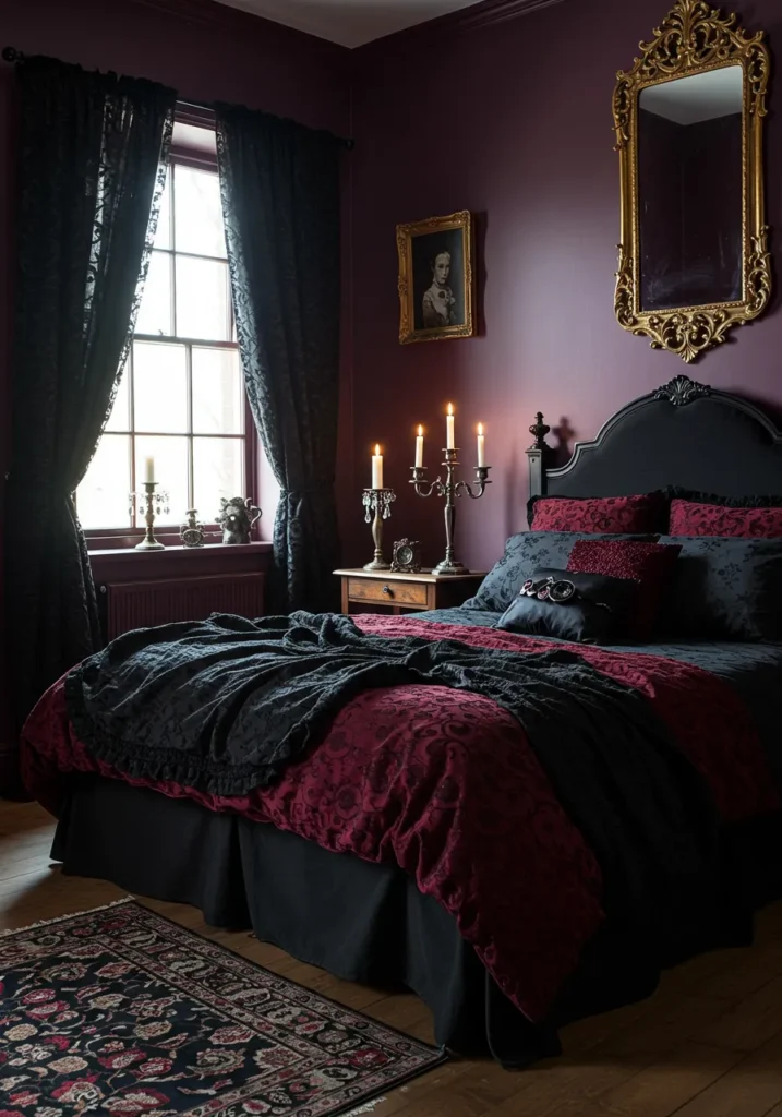 This bedroom leans fully into dark, moody elegance with its deep burgundy walls, heavy black drapes, and ornate gold mirror. The bed is dressed in rich damask-patterned bedding in shades of red and black, creating a dramatic centerpiece. Candlelight from silver candelabras casts a soft glow that enhances the gothic atmosphere, while vintage-inspired accents like the portrait and dark wood nightstand add to the hauntingly beautiful vibe.