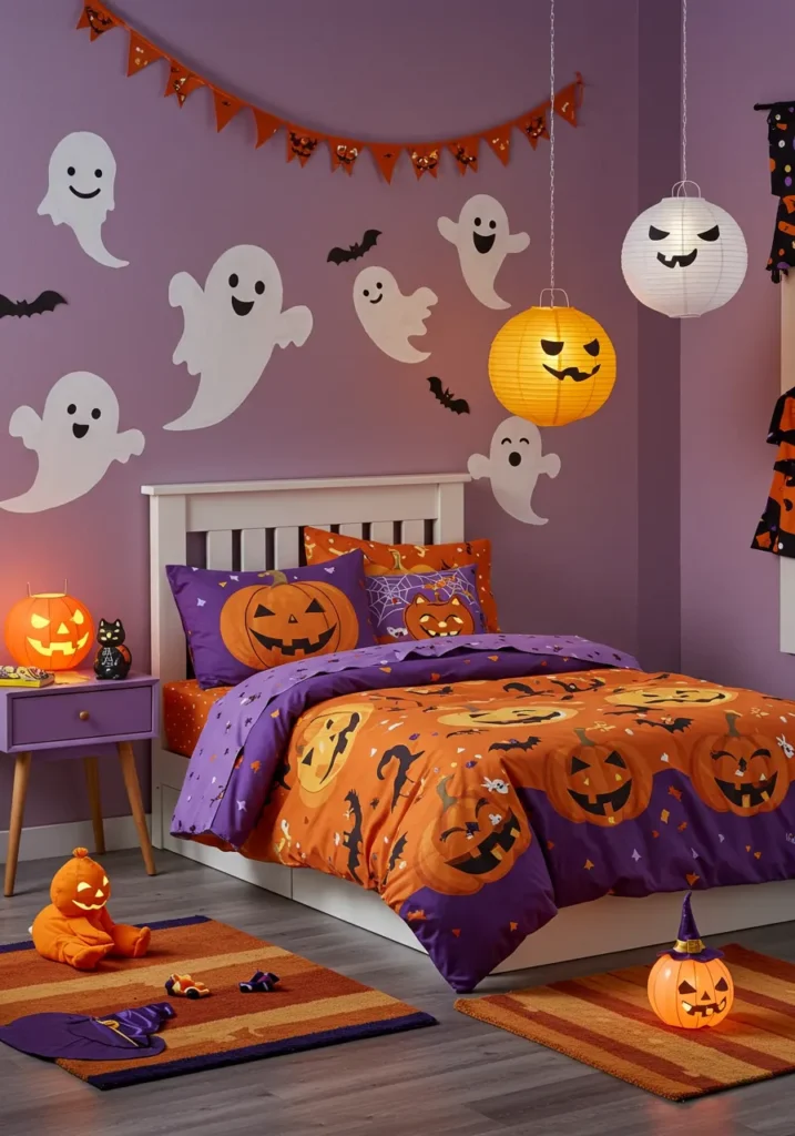 This bedroom is all about cheerful Halloween spirit. The walls are decorated with happy white ghosts and little black bats, while hanging lanterns shaped like jack-o’-lanterns add a glowing touch overhead. Bright orange and purple bedding covered in pumpkins and spooky silhouettes makes the bed the star of the room. Fun details like the pumpkin nightlight, striped rugs, and even a little plush pumpkin figure bring the whole look together in a whimsical way.