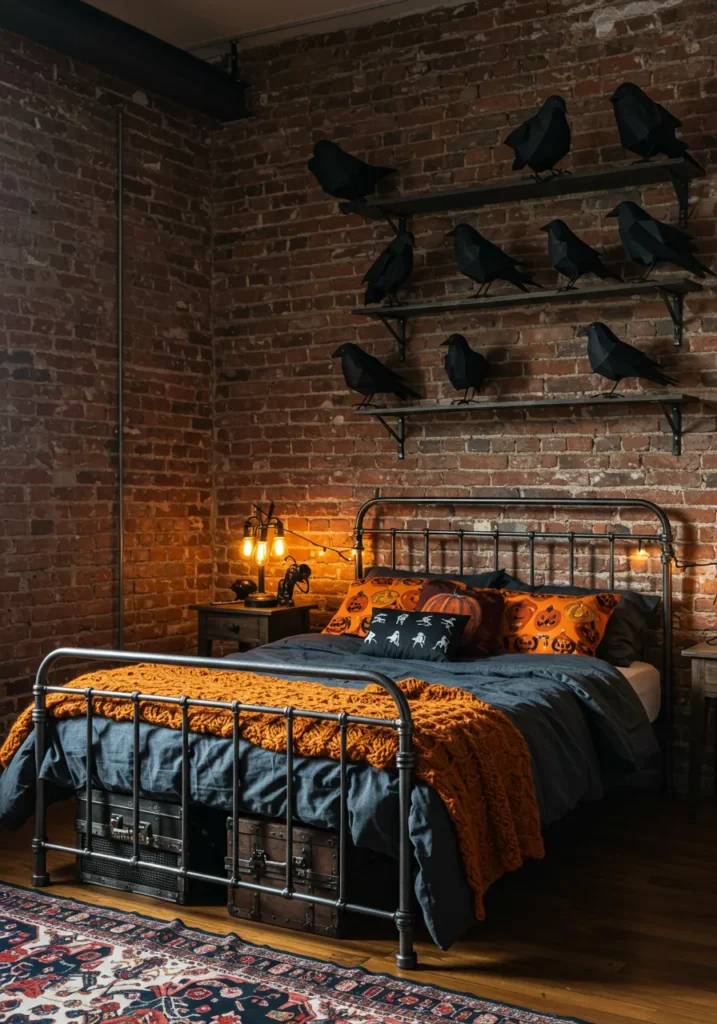 This bedroom has an edgy, industrial feel with its exposed brick walls and metal bed frame, perfectly paired with moody Halloween details. Black raven figures line the wall shelves, creating a dramatic statement, while pumpkin-themed pillows and an orange knit throw add warmth and festive charm. The vintage-style lamps and string lights bring a cozy glow that softens the darker tones of the room.