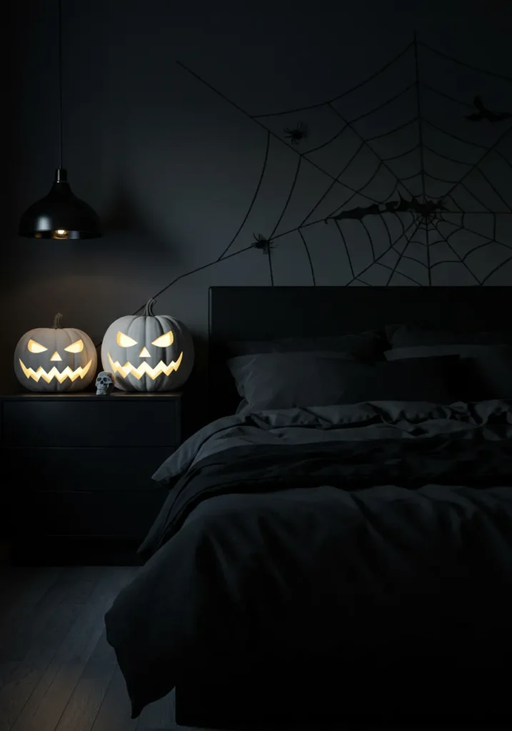 This bedroom takes a bold approach with its all-black palette, creating a dramatic backdrop for glowing Halloween accents. Two illuminated jack-o’-lanterns sit on the nightstand, their sharp grins casting an eerie light across the room. A large spiderweb wall decal with creepy crawlers adds to the spooky vibe, while the dark bedding and simple pendant light keep the overall look sleek and modern.