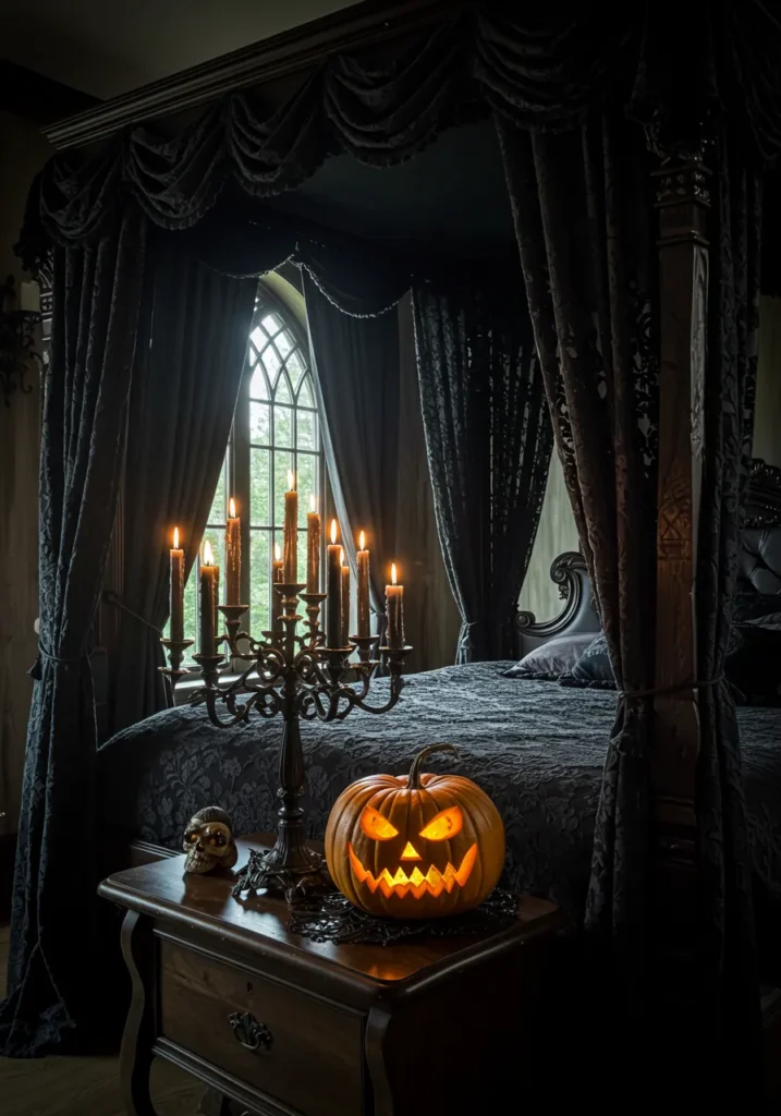 This bedroom is pure gothic drama with its grand four-poster bed draped in heavy black curtains and a tall arched window that feels straight out of a haunted castle. A carved jack-o’-lantern glows menacingly on the nightstand, paired with an ornate candelabra dripping with tall black candles. The rich, dark bedding and antique-style furniture complete the moody, theatrical atmosphere.