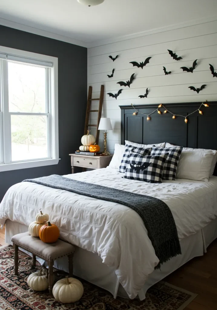 This bedroom mixes farmhouse coziness with just the right touch of Halloween flair. The crisp white shiplap walls, layered pumpkins, and soft neutral bedding create a clean and inviting base. A rustic ladder decorated with fairy lights and black paper bats adds a playful seasonal twist, while the framed bat wall art ties the theme together without overwhelming the space. The buffalo check pillow and warm throw blanket make the room feel both stylish and snug.