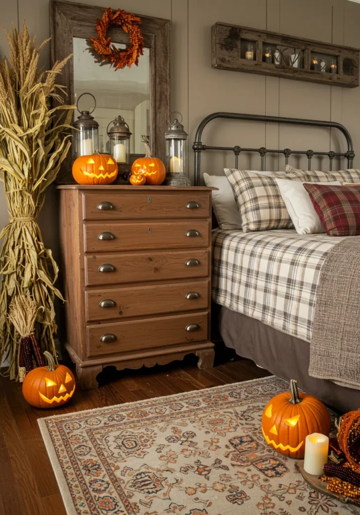 This bedroom feels like autumn wrapped in a blanket. The plaid bedding and mix of warm-toned pillows set a cozy foundation, while carved jack-o’-lanterns glow softly around the room. A bundle of dried corn stalks and rustic lanterns add farmhouse charm, and the wooden dresser with a mirror and fall wreath makes the whole space feel inviting and seasonal. Even the patterned rug ties in perfectly with the layered textures and colors.