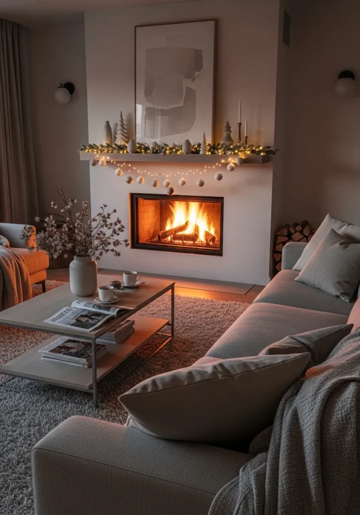 This living room feels like the very definition of cozy elegance. A modern fireplace takes center stage, wrapped in soft neutral tones and framed by a minimalist mantel adorned with tiny trees, candles, and a garland of warm fairy lights. The glow from the fire flickers gently across plush textures—a thick woven rug, layered throws, and a low coffee table with stacks of magazines waiting for quiet moments. The entire space whispers calm, comfort, and that perfect balance between modern minimalism and Christmas magic.