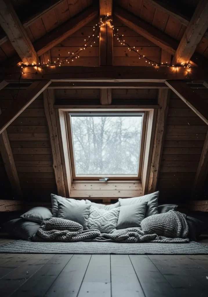 This cozy attic nook feels like a little winter dream tucked under the eaves. The warm wooden beams give the space a rustic charm, while the fairy lights draped across the ceiling add that soft, golden twinkle that makes everything instantly magical. The large window frames a snowy view, creating the perfect backdrop for a pile of plush pillows and chunky knit blankets in soothing shades of gray. It’s the kind of spot that makes you want to curl up with a book, a cup of cocoa, and absolutely no plans.