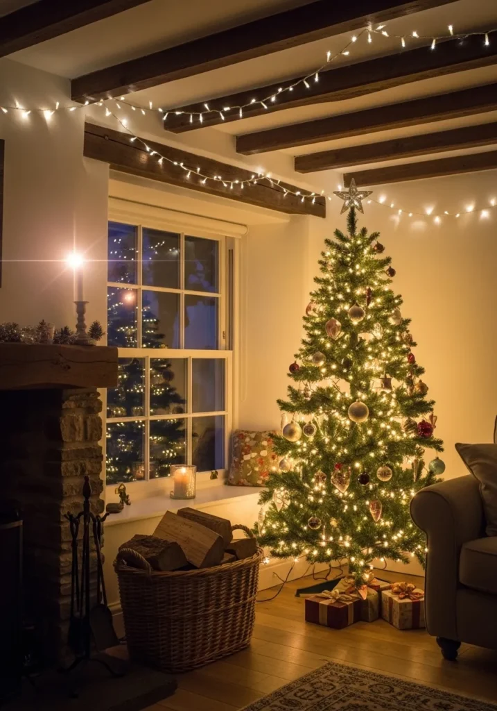 This cozy living room is the very definition of Christmas charm. A glowing tree twinkles beside a wide window, its lights reflected softly in the glass. The wooden beams overhead are wrapped with dainty string lights that stretch across the ceiling, adding an almost fairy-tale sparkle to the space. A wicker basket filled with firewood sits beside the stone fireplace, while wrapped presents wait patiently beneath the tree. The whole room feels bathed in that perfect golden light that makes winter evenings feel calm and comforting.