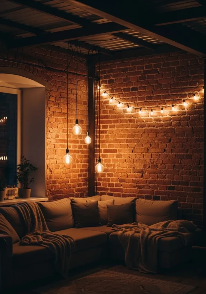 This design beautifully captures the warmth of an urban loft brought to life with soft, amber lighting. The exposed brick walls give a rustic, lived-in charm, while the hanging Edison bulbs and string lights cast a dreamy golden glow across the space. A cozy sectional wrapped in plush throws and neutral-toned pillows creates the perfect corner for curling up on chilly December evenings. Every texture here, from the brick to the knit blankets, feels intentionally layered to add depth and warmth without overwhelming the room.