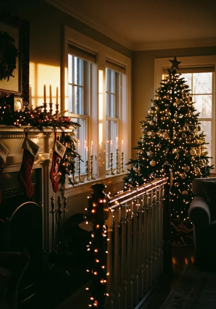 This timeless living room is the kind of space that makes you want to pause and just breathe in the magic of Christmas. The soft golden sunlight filters through tall windows, gently kissing a beautifully lit tree covered in gold and white ornaments. Along the mantel, lush garlands shimmer with fairy lights, and brass candlesticks cast a romantic flicker over neatly hung stockings. Even the staircase rail seems to sparkle with string lights that wrap every spindle, adding a warm glow that ties the whole room together.