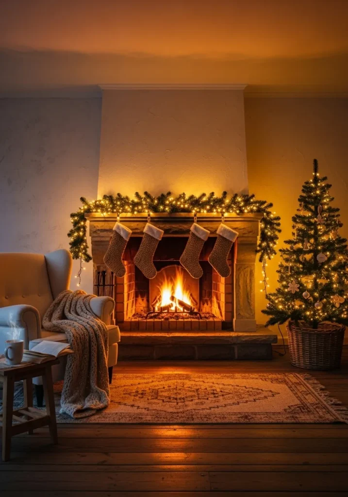 This design captures everything that makes a cozy Christmas evening feel absolutely timeless. A glowing fireplace framed with golden fairy lights sets the heart of the room, while soft knitted stockings dangle perfectly above the flickering flames. The armchair nearby looks impossibly inviting with its chunky knit throw and a steaming cup of cocoa resting on the side table. A small Christmas tree twinkles beside the hearth, and the woven basket base adds that rustic touch that makes everything feel so homey.