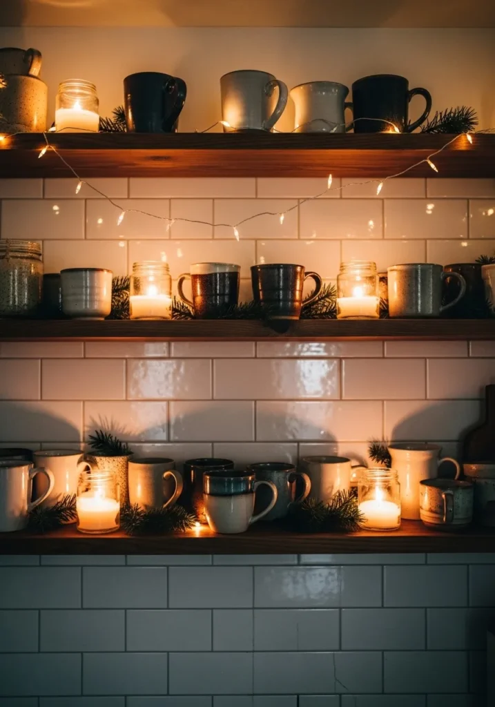 I absolutely love how this setup makes an ordinary shelf feel special. The combination of candlelight and fairy lights turns something as practical as mug storage into a moment of pure coziness. It reminds me that beauty doesn’t have to be extravagant—sometimes it’s just a few glowing jars, a touch of greenery, and the promise of hot chocolate shared with someone you love.