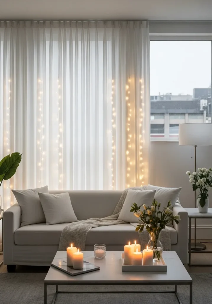 This cozy living room feels like a warm hug on a frosty December evening. The soft white sofa, draped with a textured knit throw, sets the perfect base for a calm and neutral palette. Twinkling fairy lights peek through sheer curtains, creating that dreamy golden shimmer that instantly makes the space feel alive. Add a few glowing candles on the coffee table, fresh white blooms in simple glass vases, and you’ve got a setting that feels effortlessly elegant yet wonderfully inviting.