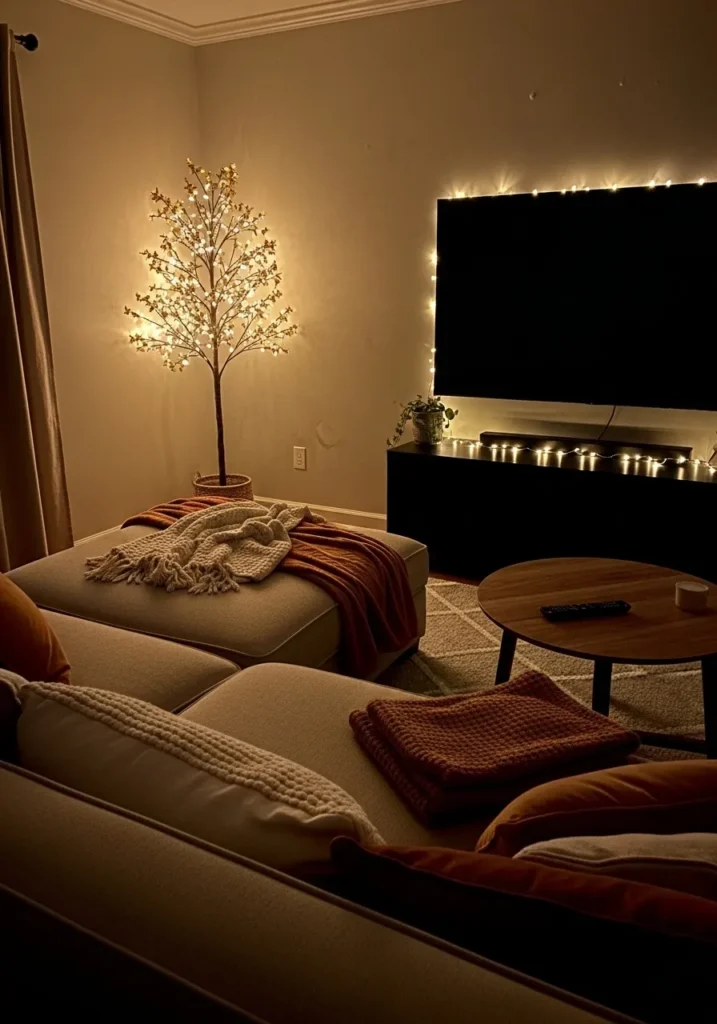 This cozy living space feels like the perfect spot to unwind after a long winter day. The warm fairy lights framing the TV add a gentle glow that instantly makes the room feel comforting. A dainty lighted tree in the corner adds a touch of festive sparkle without being over the top, while the neutral furniture paired with rust and cream throws gives everything a soft, inviting warmth. The round wooden coffee table and woven basket planters complete the natural, homey vibe.