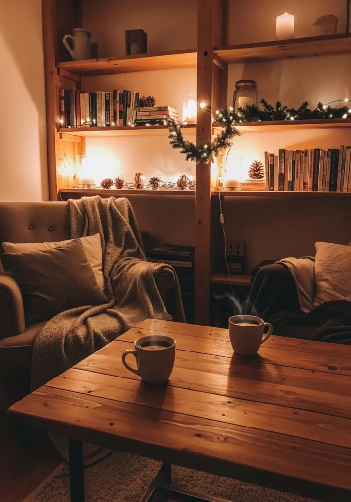 This cozy little corner feels like the kind of space where time slows down. A soft armchair wrapped in a chunky throw sits beside a rustic wooden coffee table, perfectly paired with two steaming mugs waiting to be enjoyed. Shelves lined with books, pinecones, and twinkling fairy lights add that dreamy Christmas sparkle without going over the top. The warm, amber glow from the candles and garland creates an atmosphere that feels peaceful and deeply personal, like the world’s most comforting hug in room form.