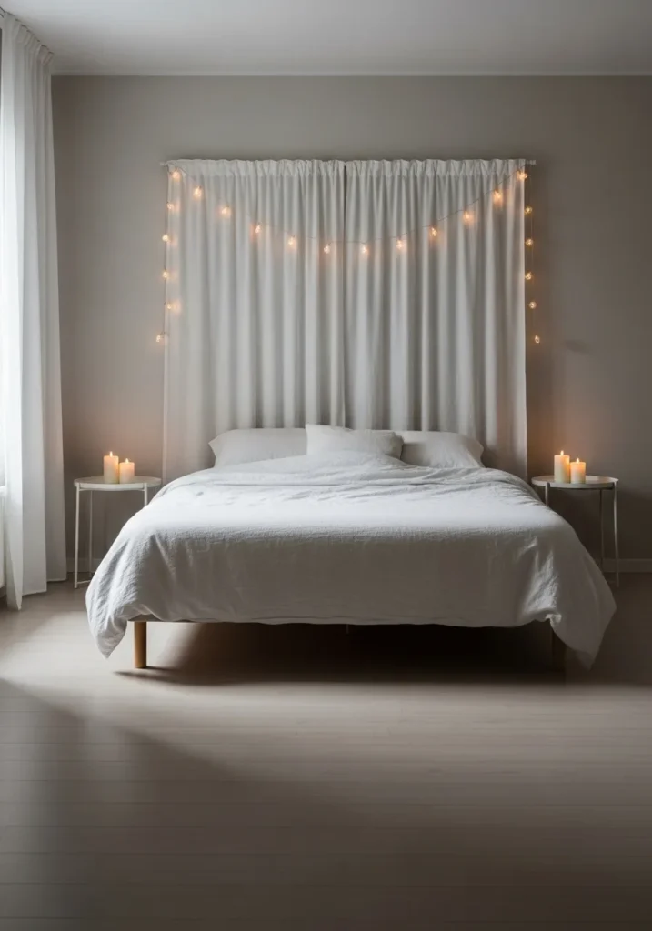 This bedroom is the definition of calm simplicity. The soft white curtains behind the bed act as a gentle backdrop for the string lights that drape like a glowing garland, adding a quiet sparkle without being overwhelming. The white bedding looks crisp and inviting, while the flickering candles on each nightstand bring a touch of cozy warmth to the neutral space. Every element here whispers peace, from the smooth wooden floor to the muted wall color that lets the lights take center stage.