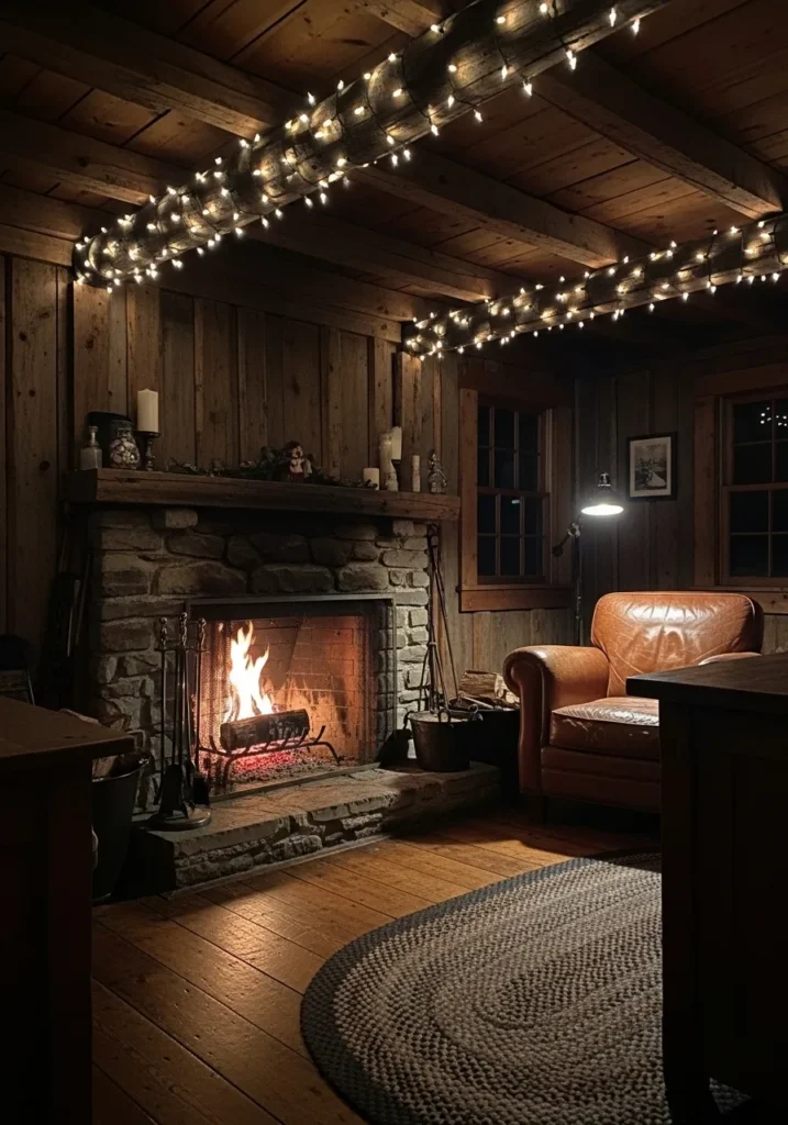 This cozy corner feels like something straight out of a Christmas postcard. The room’s charm comes from its rustic wooden walls and exposed beams wrapped in twinkling fairy lights that cast a soft, golden shimmer across the space. A stone fireplace glows with a crackling fire, filling the room with warmth that matches the rich tones of the leather armchair and the woven rug underfoot. The mix of textures—rough timber, smooth leather, and flickering lights—creates a snug, nostalgic feeling that’s pure comfort on a winter night.