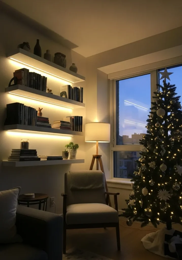 This cozy little corner perfectly balances simplicity and warmth. Clean white shelves lined with books and soft LED lighting create a gentle, layered glow that feels both modern and comforting. The neutral tones of the furniture, paired with the golden shimmer from the Christmas tree lights, make the space feel like a quiet retreat from the holiday rush. The window brings in that beautiful evening blue, giving the whole room a calm, serene atmosphere.