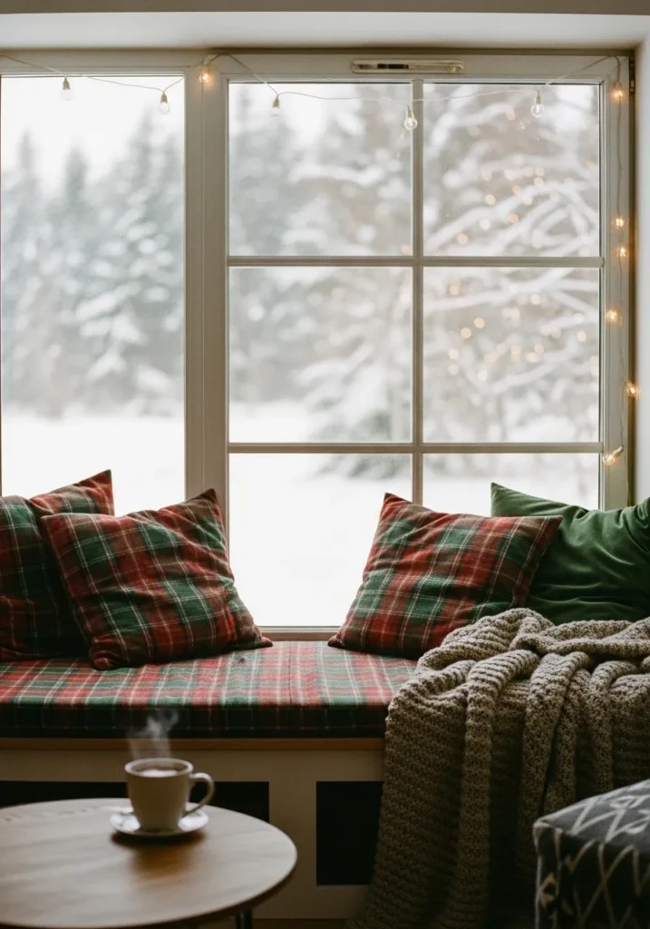 This cozy corner looks like something straight out of a Christmas movie. The wide window frames a dreamy snowy view, while soft string lights trace the outline with a gentle golden sparkle. A built-in bench lined with red and green plaid cushions feels wonderfully nostalgic, especially with a chunky knit blanket casually draped over the edge. The small wooden table and steaming mug complete the scene, making it the perfect little hideaway for a quiet winter morning.