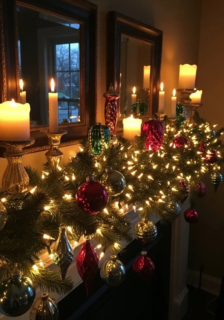 This elegant mantel design feels like a warm holiday hug wrapped in soft candlelight. The rich garland is woven with golden fairy lights, sparkling ornaments in shades of ruby red, emerald green, and silver, and a series of glowing pillar candles perched on ornate holders. The reflections in the mirrors behind double the magic, making the entire space shimmer with that nostalgic Christmas glow we all secretly crave.