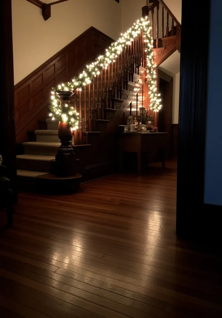 This charming staircase feels straight out of a cozy holiday movie, with soft white lights twinkling along the garland that wraps perfectly around each spindle. The warm wooden banister and paneling give the whole space a nostalgic, old-world glow, while the polished floors reflect the lights just enough to make the entire hallway shimmer. It’s simple, elegant, and exactly the kind of setup that makes you want to pad down the stairs in fuzzy socks on Christmas morning.