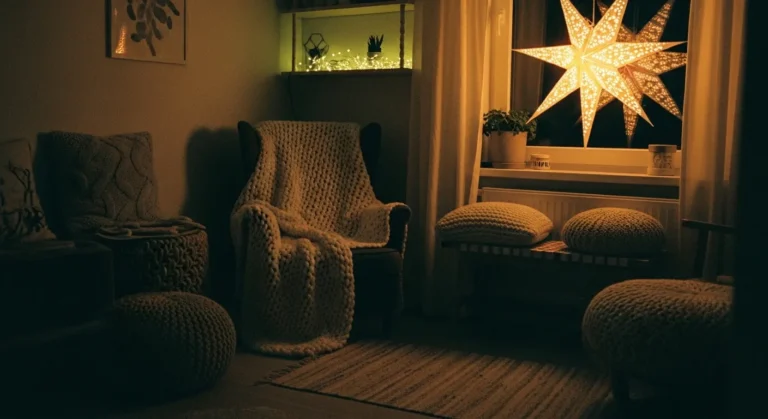 I absolutely love how this room manages to feel so warm and inviting without a single hint of clutter. The simplicity is what makes it shine. There’s something about those golden lights mixed with natural textures that makes me want to curl up with a cup of cocoa and stay put for hours. It’s proof that cozy doesn’t have to mean overdone—it’s all about the glow and the feeling of home.