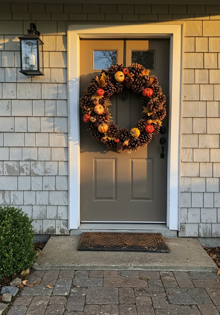 A simple shingled entry is made festive with a large pinecone wreath accented with tiny pumpkins and fall leaves. The warm golden sunlight highlights the natural tones and makes the muted door color feel cozy and welcoming.
