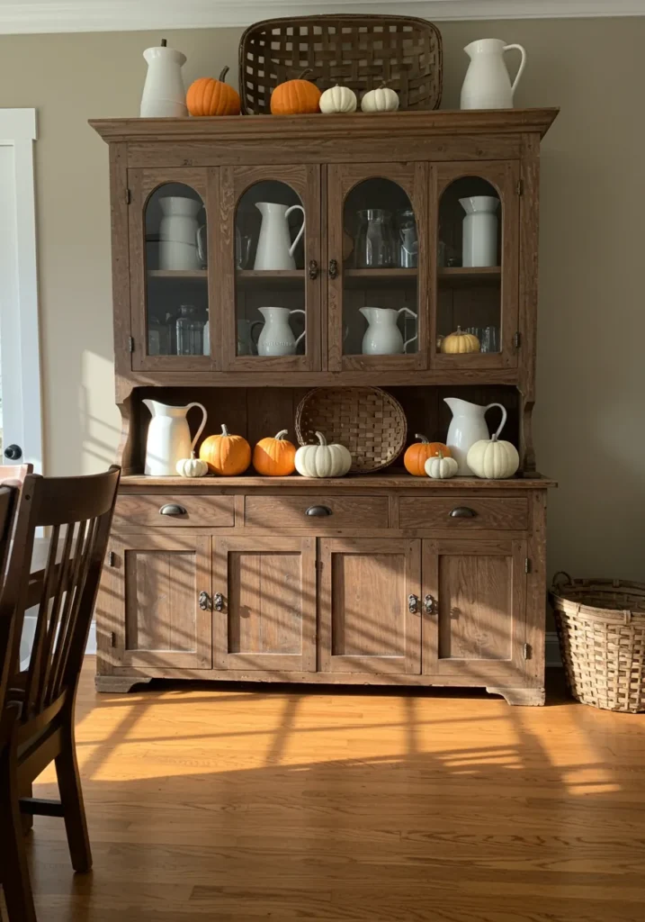 A wooden hutch filled with simple white pitchers is decorated with small pumpkins across the top and shelves. The warm afternoon light makes the wood glow and highlights the fall details.