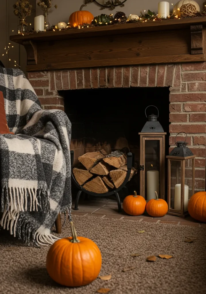 A rustic brick fireplace is dressed with lanterns, glowing candles, and a garland of pumpkins and pinecones. A plaid blanket draped nearby adds that extra cozy layer.