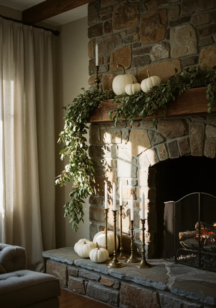 Here, a sturdy stone fireplace is softened with cascading greenery and crisp white pumpkins on the mantel. Brass candlesticks add a touch of elegance while the textures of the stone and wood beam keep it grounded and rustic.