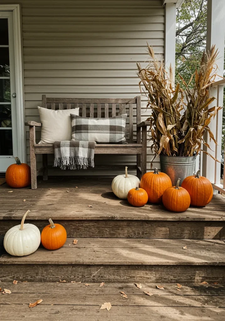 A wooden bench with plaid pillows and a throw sits on a rustic porch, surrounded by pumpkins and a galvanized bucket filled with dried cornstalks. The setup is simple but so inviting.