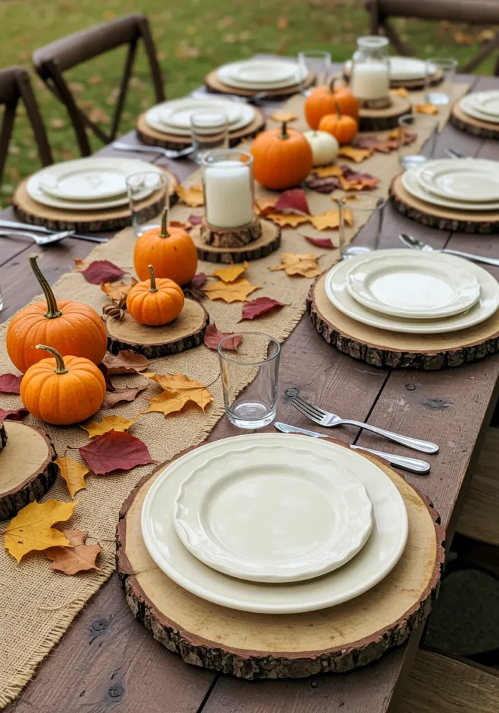 A wooden outdoor table is dressed in a burlap runner with mini pumpkins, autumn leaves, and rustic wood slice chargers. The mix of textures creates a casual yet pulled-together Thanksgiving table that feels perfect for gathering outside.