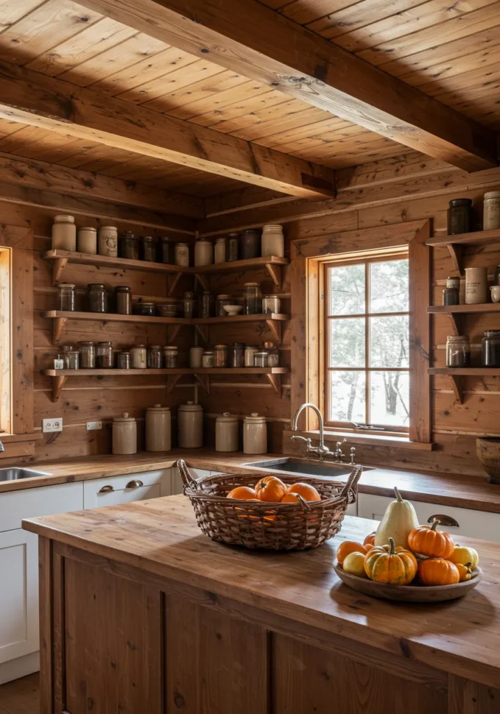 Warm wood walls and open shelves create a classic farmhouse kitchen filled with ceramic jars. On the island, baskets and bowls of pumpkins bring a seasonal touch without overpowering the cozy simplicity of the space.