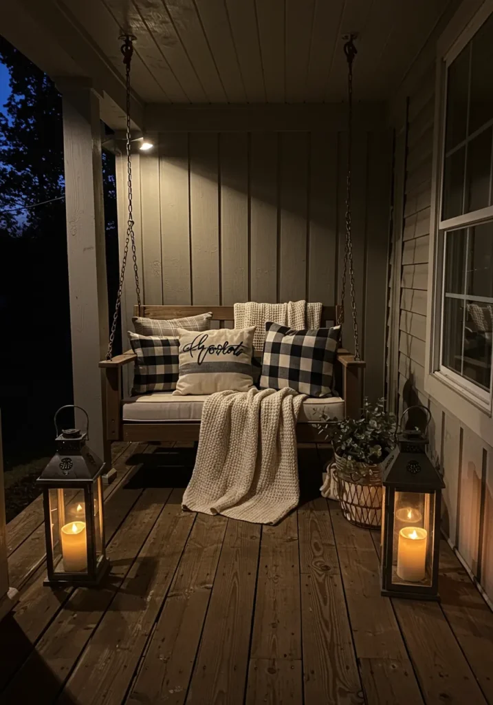 A wooden porch swing styled with plaid pillows and a chunky knit blanket sits under the soft glow of lanterns. The flickering candlelight makes the entire space feel like a snug little corner perfect for fall evenings.