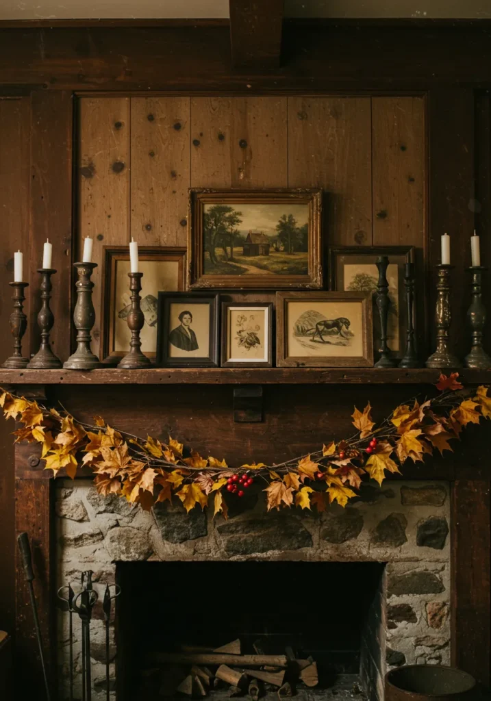 This fireplace mantel is dressed in old-world style with dark wooden candlesticks, framed artwork, and a garland of golden autumn leaves. The stone base adds that raw, timeless look while the warm wood paneling above ties the whole rustic scene together.