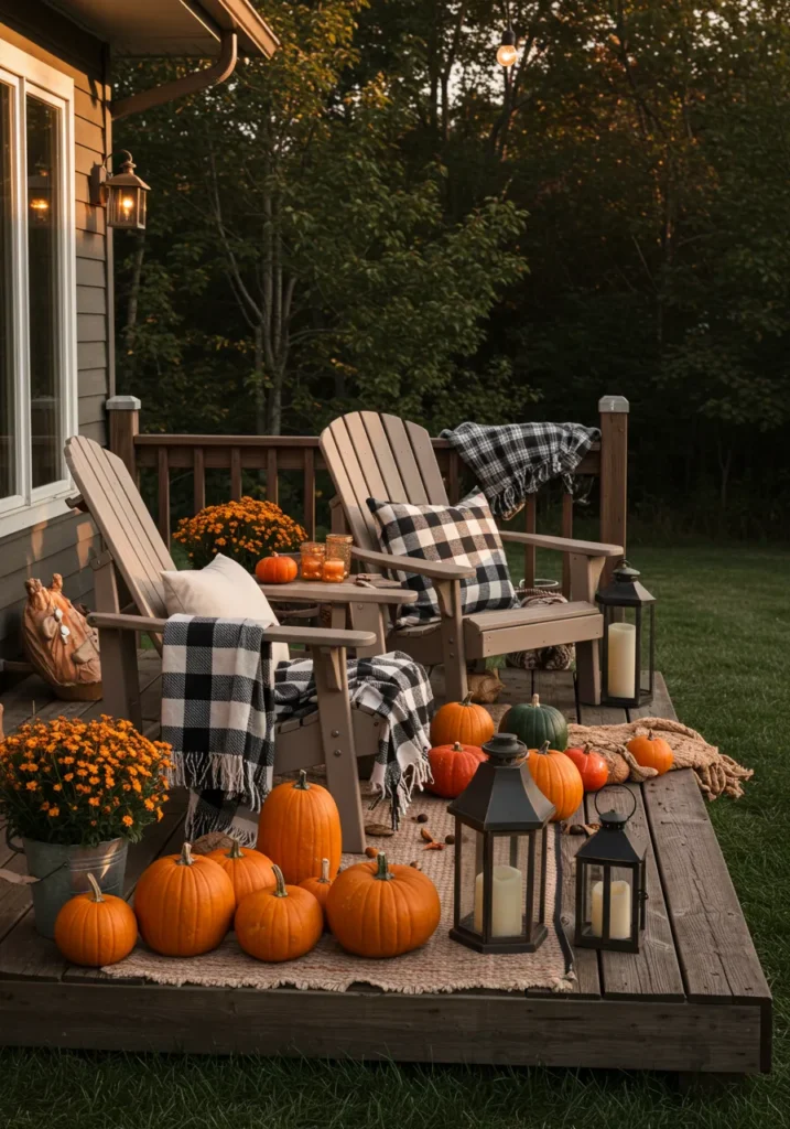 Two Adirondack chairs sit side by side on a wooden deck, surrounded by pumpkins, lanterns, and mums. Plaid throws and pillows add a cozy layer, making it the perfect fall evening retreat.